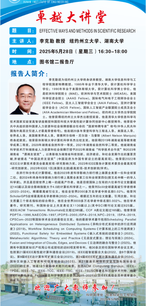 卓越大讲堂之学术讲座通知(李克勤 纽约州立大学、湖南大学教授)
