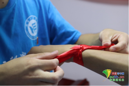 志愿者为孩子系上红丝带。中国青年网通讯员 梁艳 摄