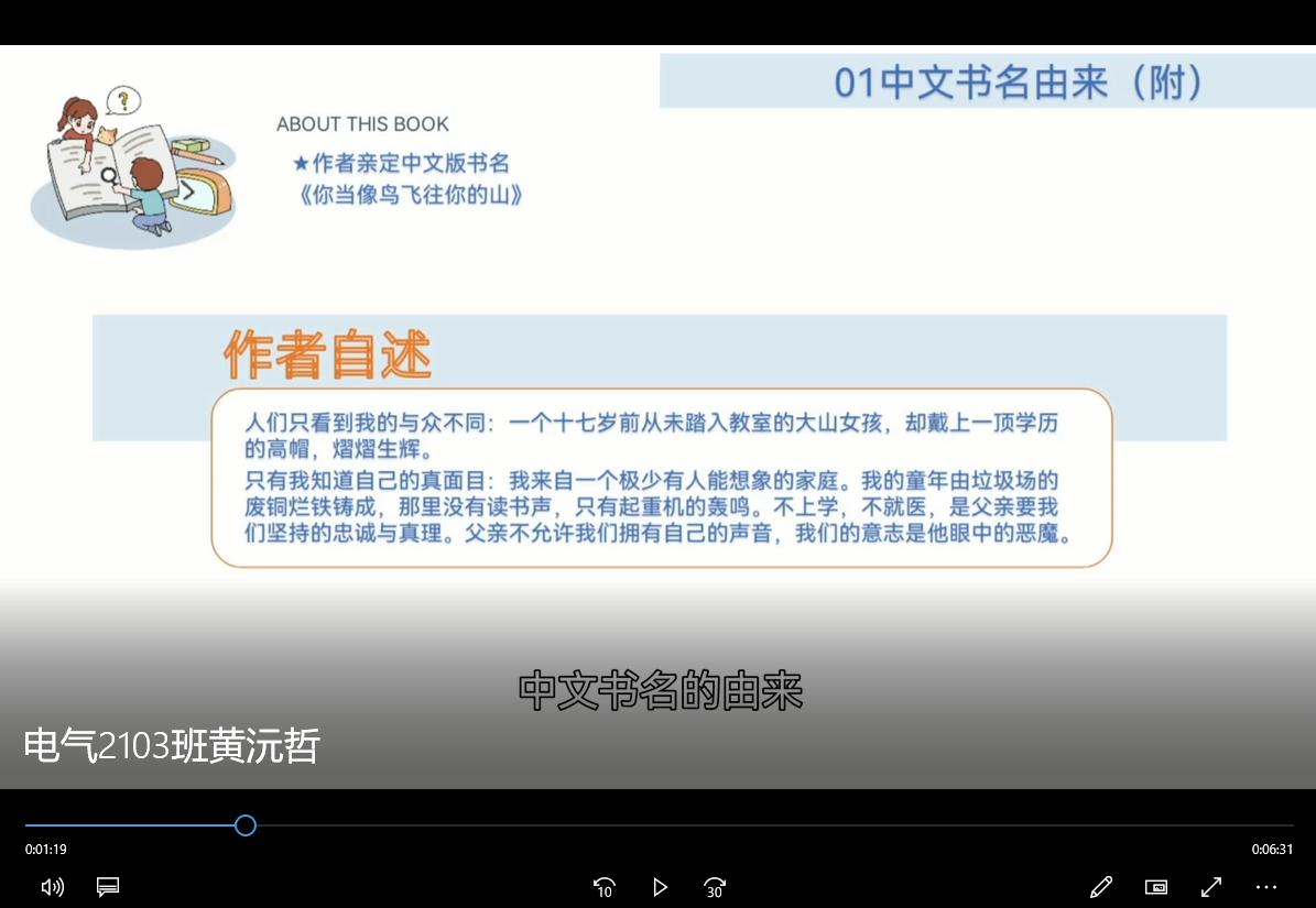 电气2103班黄沅哲给大家分享的是《你当像鸟飞往你的山》,这是一本非常厚重的个人自传体,讲述一个在17岁之前没有上过学,没有受过正规教育的女孩,最后靠自己的努力,成为了剑桥大学的哲学硕士、剑桥的历史博士,书中详细讲述了这个转变是如何完成的,一路来发生的故事和她的心路历程。