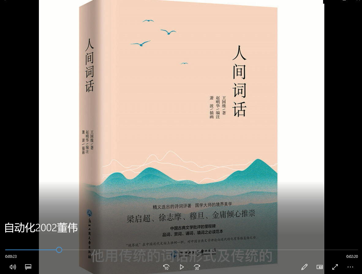《人间词话》是王国维所著的一部文学批评著作。该作是作者接受了西洋美学思想之洗礼后,以崭新的眼光对中国旧文学所作的评论。本书的理论核心是“境界”说,该书观点新颖,立论精辟,自成体系,特别是书中提出的三重境界说一直受到国内外学者的重视。自动化2002班董伟为我们带来了这本书的介绍。