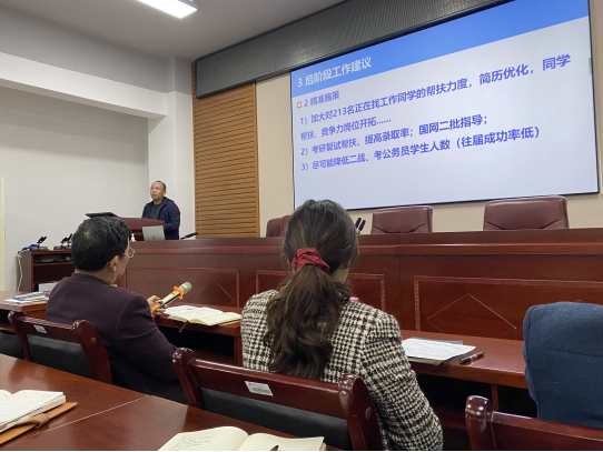 会上,学院党委副书记李延平介绍了当前严峻的就业形势,解读了学校就业工作相关要求,通报了各毕业班学生的就业落实情况,以及当前和今后一段时间就业工作的重点任务。李延平强调,就业工作是民生工程,多方高度关注,全院老师要齐心协力,想办法、找对策,共同推动毕业生高质量充分就业。