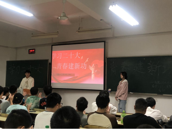 主讲人谢宗烨以播放量爱国视频、PPT讲解的方式和同学们一起学习了党的二十大报告的主要相关内容,并摘要了党的二十大“金句”与同学们分享,令人印象深刻。