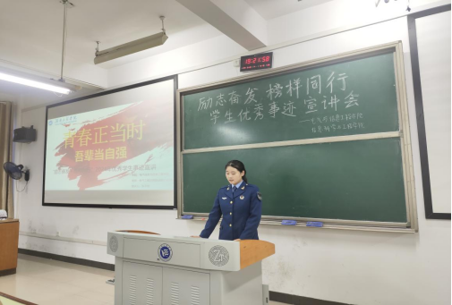 宣讲会由国家奖学金获得者周芸瑛、陈旭东,“美育之星”龚艳星、“励志之星”刘辉祥、退役士兵优秀学生张子怡组成。他们用生动的语言、感人的经历,从学习研究、实践创新、时间规划、自强励志等方面,向学弟学妹们讲述了自己在学习与生活中获得的经验和感悟,以积极、勤奋、执着和乐观的精神感染、激励着在场的每位同学。