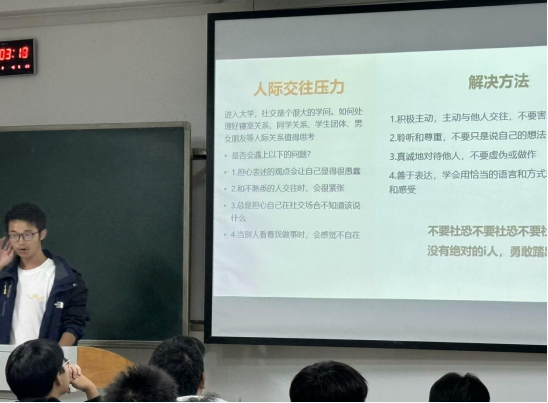 宣讲人强调了心理健康对学生成长的重要性,鼓励大家积极参与到活动中来,还分享了他们在学习和生活中的心理体验与应对策略。详细讲解了常见心理问题的表现及解决办法,介绍了我校心理健康教育与活动中心和朋辈心理互助公的职能。