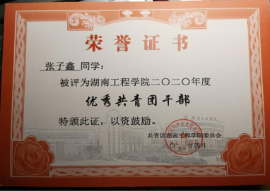 她带头树立先锋模范,争当优秀团员,曾获优秀共青团干部、团干部培训优秀学员、美誉之星。带领班级团支部成员及青年,不断加强团的基层组织建设,推进班级团内各项事务有序快速发展,将班级团支部建设成有凝聚力、积极向上、充满活力的团支部。在团中央基层建设部指导的、中国青年报主办的2020-2021学年高校活力团支部遴选活动中,经过层层推选,最终被确定为“2020-2021学年高校活力团支部”,班级团支部建设典型经验被中国青年报等官方主流媒体报道宣传。