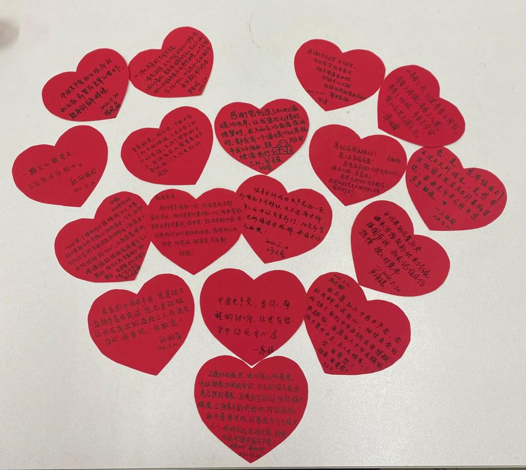 “中国共产党如火堆,而我如火苗”“一颗红心跟党走,不负岁月守初心”全体同志们在红心上写下对党的告白语,表达着对党的满满爱意和深深的崇敬。