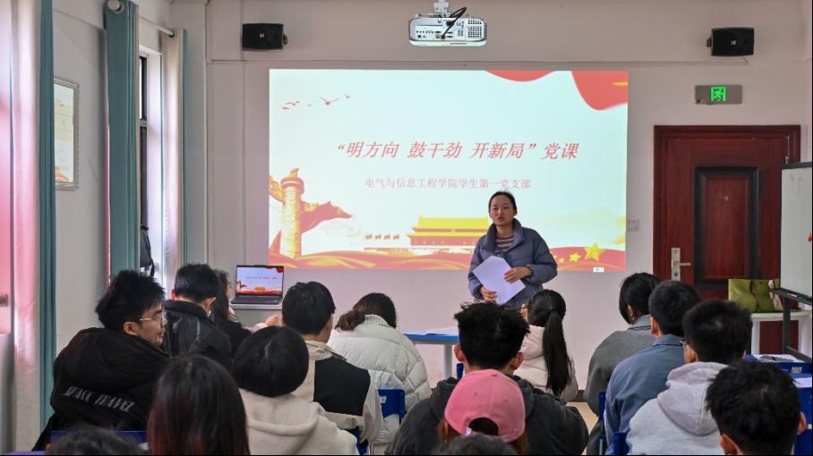 党课伊始,支部书记洪思玮同志围绕党的二十大报告中关于中国式现代化的重要论述,系统阐释中国式现代化的五大特征和坚持中国共产党领导,以高质量发展为核心,推动全过程人民民主与共同富裕的本质要求。结合习近平总书记在全国教育大会上的讲话精神,洪思玮同志认为:“中国式现代化不仅是国家发展的战略蓝图,更是青年学子奋斗的航标。学生党员更要立足专业所学,将科技创新融入现代化建设的‘大棋局’中。”