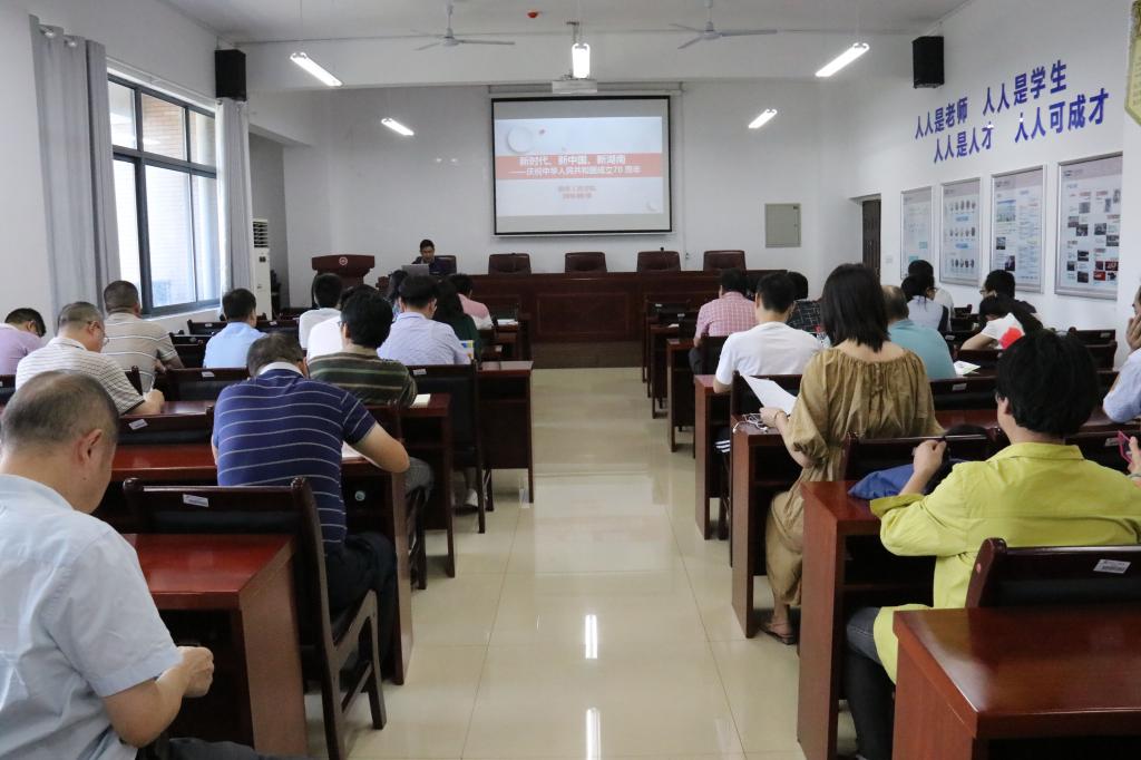 9月24日下午2点半,伟德betvlctor1949源于英国举行庆祝中华人民共和国成立70周年宣讲活动,党总支书记黄望军以“新时代、新中国、新湖南”为题进行了宣讲,从新中国新湖南70年发展成就辉煌、新中国新湖南70年发展经验弥足珍贵、对历史最好的纪念就是创造新的历史三个方面进行了讲解。通过宣讲,大家对新中国70年的发展成就及湖南70年来的变化感到骄傲和自豪,对未来充满了希望和奋斗的动力,宣讲反响热烈。