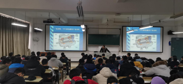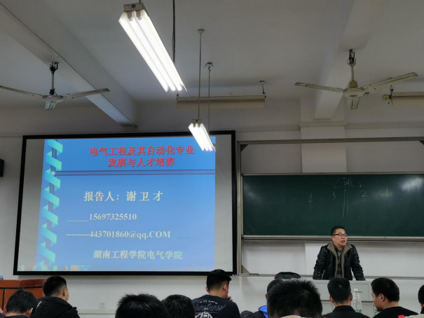 谢卫才向同学们介绍了电气工程专业的历史演变,即电机工程→电气工程→电气工程及其自动化,并指出该专业的范围涉及电机电器及其控制、电力系统及其自动化、高压绝缘技术与电气技术,该专业的主要研究方向是电能的产生、传输、转换、控制、利用与储存。介绍了我国的电力配置、输电技术以及电机电器的发展,本专业的发展前景、电气工程近年来所遇到的挑战与机遇。“我校电气工程及其自动化的历史前身是1951年中央机械工业部成立的电机电器专业,该专业从成立之初到现在已经向全国电机电器行业输送上万名优秀人才,对我国电气事业做出了重大贡献”,谢卫才说,“希望同学们能够续写电气工程的精彩!”