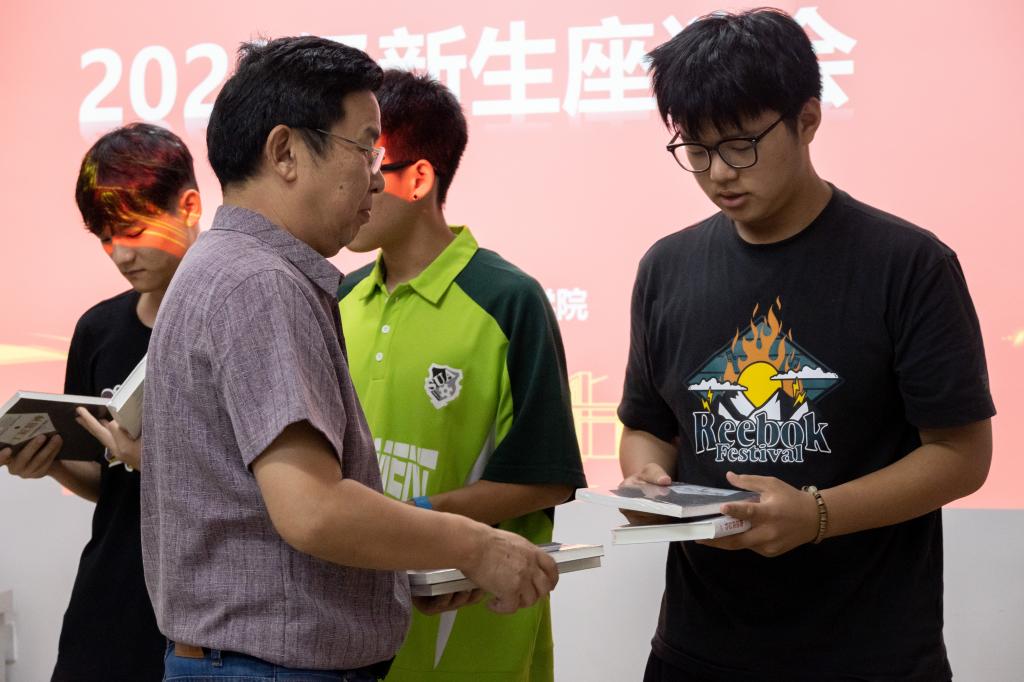 “学长学姐热情地帮助我搬运行李、办理入住手续,使我忐忑不安的心瞬间安定了下来”“学校食堂饭菜可口,种类很多”“我和父母去图书馆、教室转了一下,感受到了学校浓厚的学习氛围”,“我打算考研,用自己所学知识更好的为祖国服务”……座谈会上,来自全国各地的新生代表纷纷表达对学校的“初印象”,他们踌躇满志,对未来四年的大学生活充满期待。老师们代表学校向各班新生代表赠送了优秀通俗理论读物《马克思靠谱》、以涵养工匠精神为主题的《工匠精神》等书籍,希望同学们在班级传阅和学习,以正确的理论武装自己的头脑,传承工匠精神,在今后的求学之路上能够精益求精、不断追求卓越。