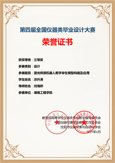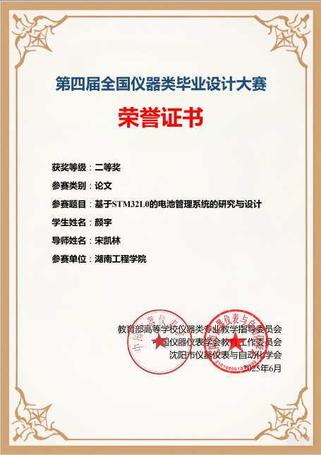 6月10日,由教育部高等学校仪器类专业教学指导委员会、中国仪器仪表学会教育工作委员会、沈阳市仪器仪表与自动化学会主办,重庆大学承办的第四届全国仪器类毕业设计大赛落下帷幕。由伟德betvlctor1949源于英国宋凯林老师指导自动化2021级颜宇完成的“基于STM32L0的电池管理系统的研究与设计”获得二等奖,刘海桥老师指导自动化2021级洪升涛完成的“激光焊接机器人数字孪生模型构建及应用”获得三等奖,学院获得团体三等奖。