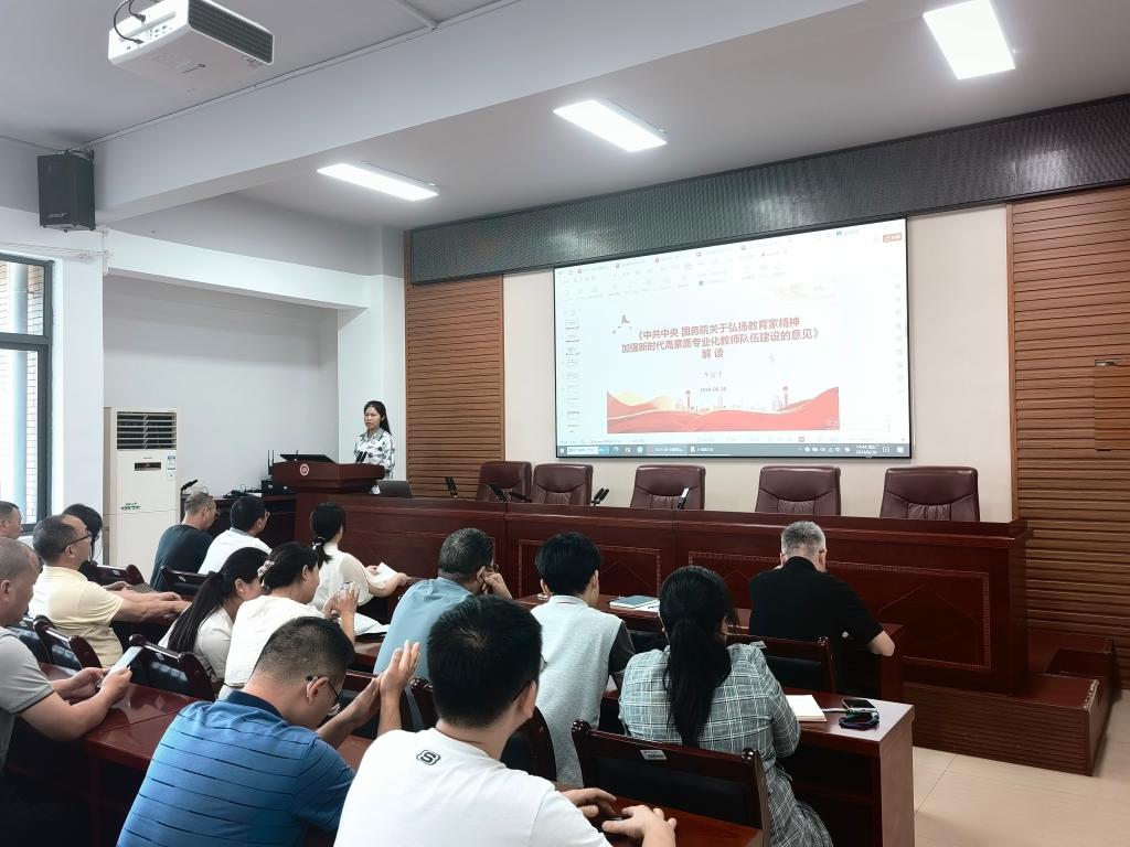 谢卫平书记就学校下发的关于《认真学习贯彻弘扬教育家精神,加强新时代高素质专业化教师队伍建设意见》的通知进行了说明,要求全体老师认真学习并贯彻落实文件精神,为培养新时代高素质人才贡献力量。李延平副书记解读了《中共中央 国务院关于弘扬教育家精神加强新时代高素质专业化教师队伍建设的意见》。全体教职工认真学习了《中共中央 国务院关于弘扬教育家精神加强新时代高素质专业化教师队伍建设的意见》