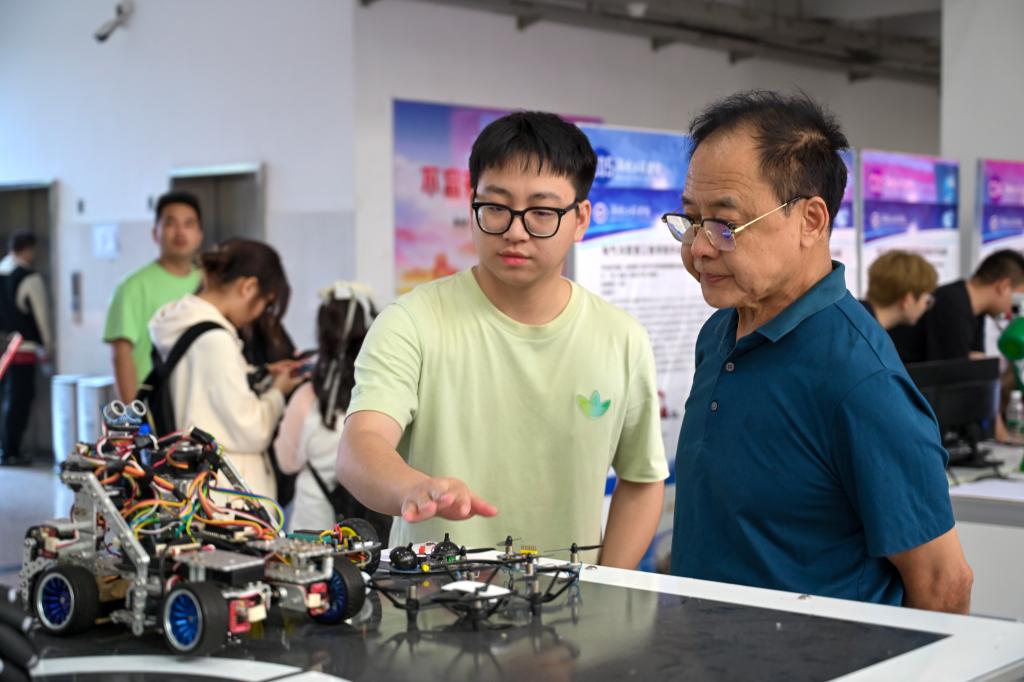 活动现场,无人机、智能机器人、智能小车、智能手环、新式厨房安全监控、机械臂、手势控制运动小车等作品纷纷亮相,吸引了师生前来观看。“机械臂好灵活啊”“智能小车功能好多啊”同学们对避障机械臂和智能机器人表现出浓厚的兴趣。毕业生肖若虚耐心地回答了现场评委和师生关于智能机器人和智能小车机器视觉、自动驾驶等方面的问题,介绍了智能交通系统关键技术-三位点云目标检测,并对半监督学习优化方法、提升模型对未标记数据的监督利用能力、赋予模型更多的数据理解能力做了详细解说。